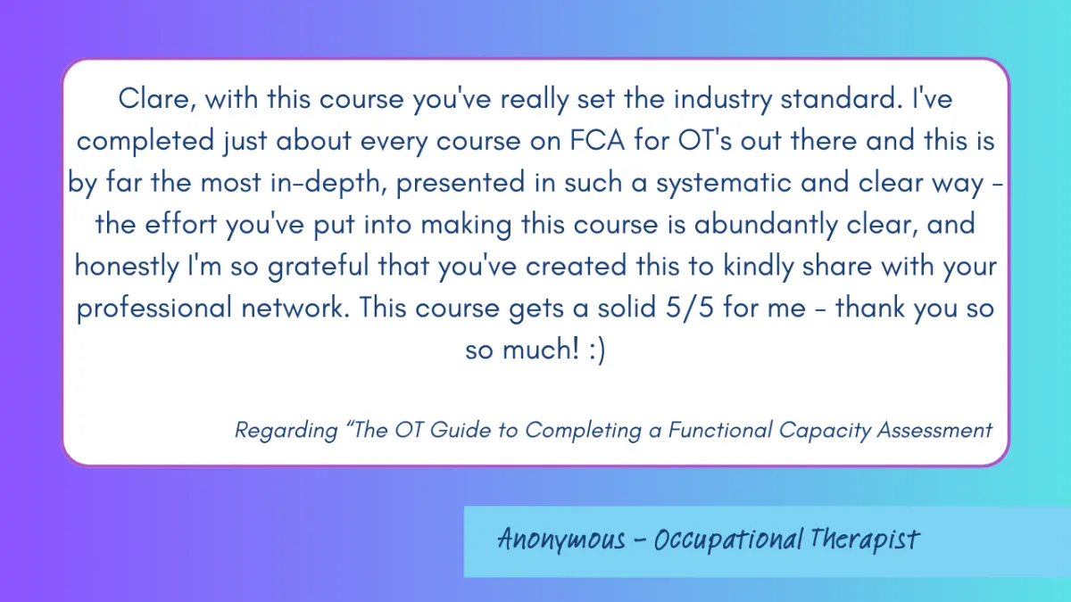 Clare, with this course you've really set the industry standard. I've completed just about every course on FCA for OT's out there and this is by far the most in-depth, presented in such a systematic and clear way - the effort you've put into making this course is abundantly clear, and honestly I'm so grateful that you've created this to kindly share with your professional network. This course gets a solid 5/5 for me - thank you so so much! :)