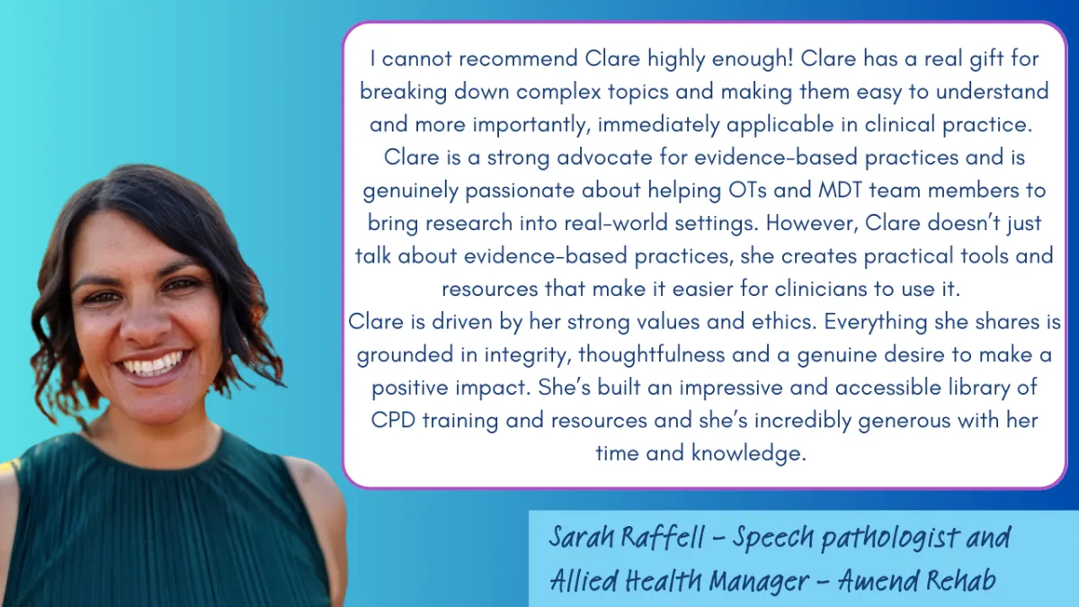 Clare has done a fabulous job with spearheading 'Your OT Tutor', a journal club that has really helped me stay up to date with the current evidence on topics directly relevant to my practice. Her approach is comprehensive yet practical, given how time-poor clinicians often are, and I am very much looking forward to our 2023 sessions. I highly recommend Clare to other OTs - those starting out as well as others who are more established in the profession - she is an absolute asset to both.