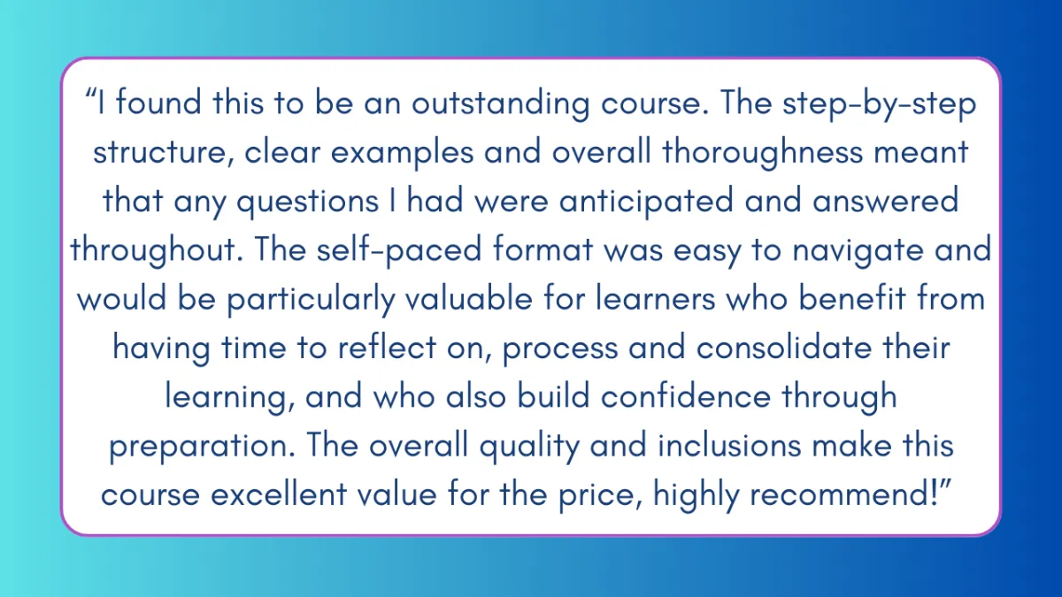 Clare, with this course you've really set the industry standard. I've completed just about every course on FCA for OT's out there and this is by far the most in-depth, presented in such a systematic and clear way - the effort you've put into making this course is abundantly clear, and honestly I'm so grateful that you've created this to kindly share with your professional network. This course gets a solid 5/5 for me - thank you so so much! :)