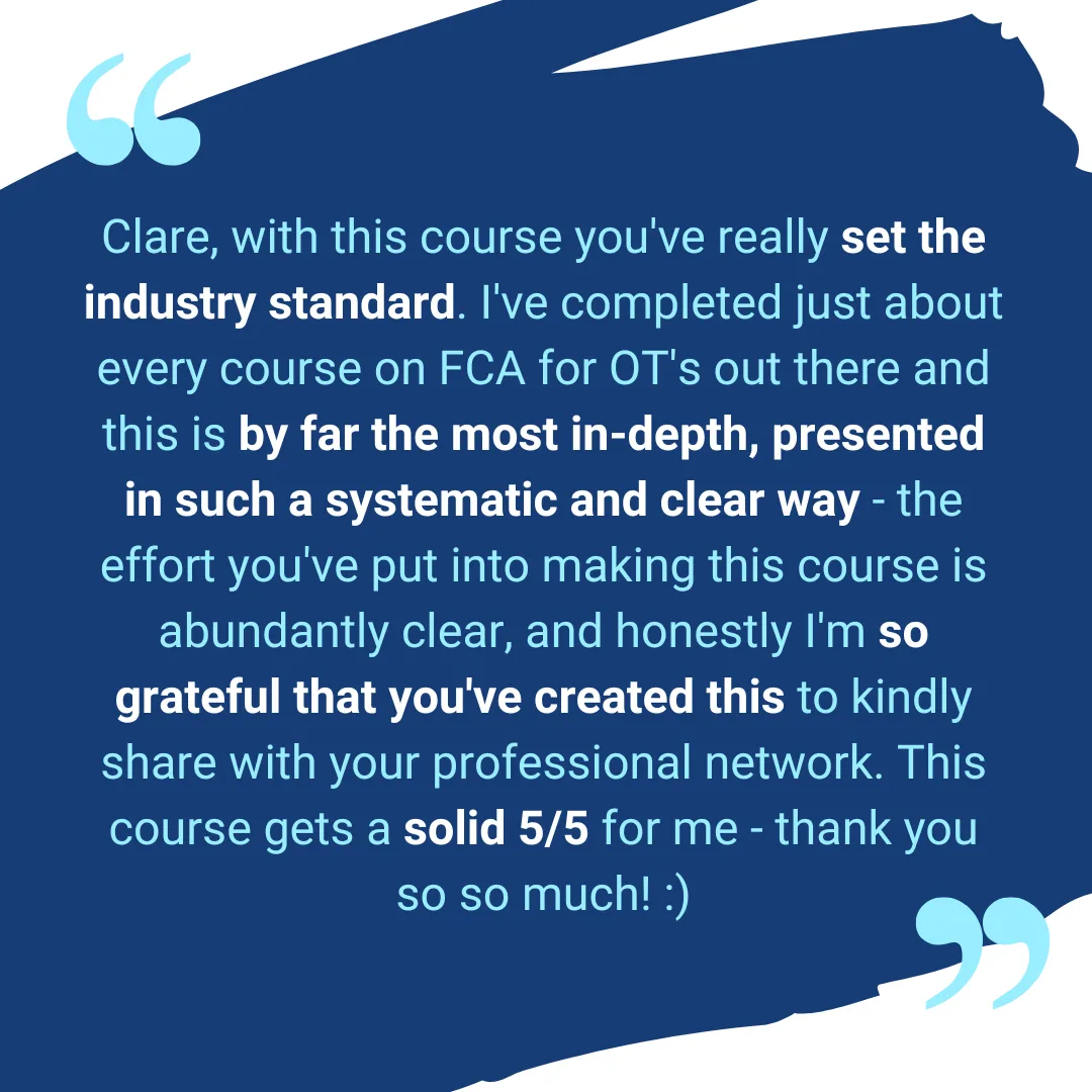 This template and course were created with examples, tips and links to extra resources with adult NDIS participants in mind. The overall structure of the template and many of the examples and principles will be applicable to a paediatric caseload, especially older adolescents, but there are no paediatric specific examples included within this template. Likewise the FCA process outlined in the course will be transferable to a paediatric population, however there are no paediatric specific case studies. Many paediatric OTs have completed the course and found it helpful, however I would recommend any new graduate paediatric OTs discuss this course with their supervisor before purchasing (I don't want it to confuse you!).