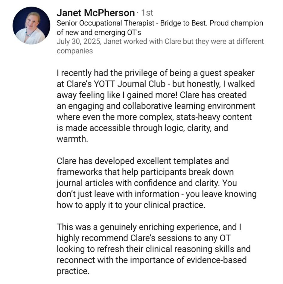 2. Article summary – Clare will recap the who, what, when, where and why! You’ll get an overview of the key findings and what they mean for OTs.